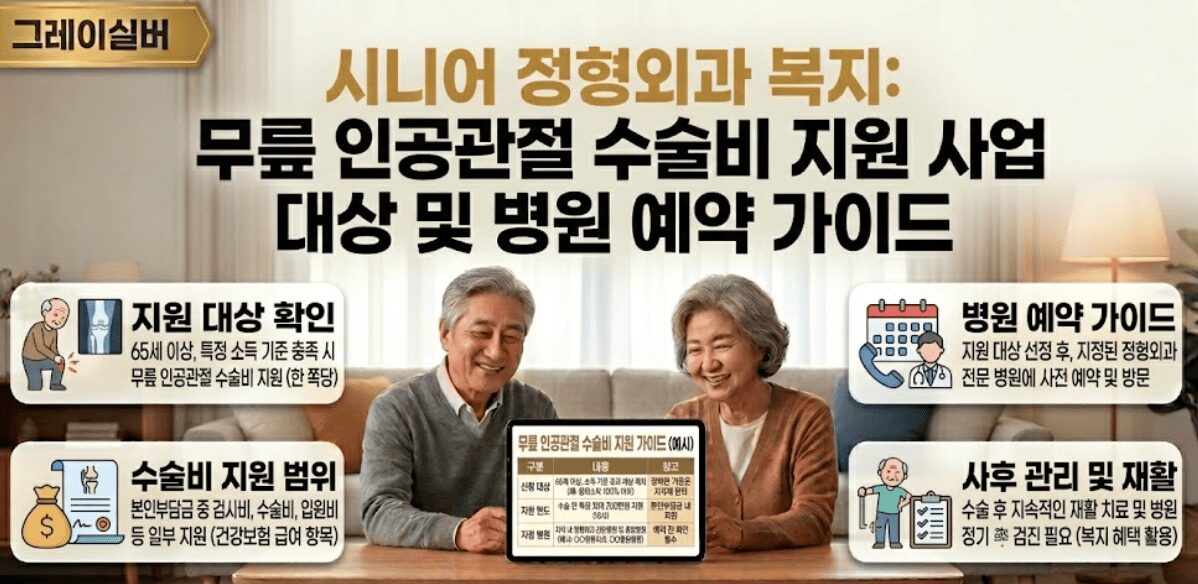 퇴행성 관절염으로 무릎이 닳아 걷기 힘든 어르신들을 위해, 국가가 인공관절 수술비를 직접 지원하는 사업입니다. 수술비 걱정에 치료를 미루다 증상이 악화되는 악순환을 끊기 위해 보건복지부가 시행하는 핵심 노인 의료복지 제도입니다.