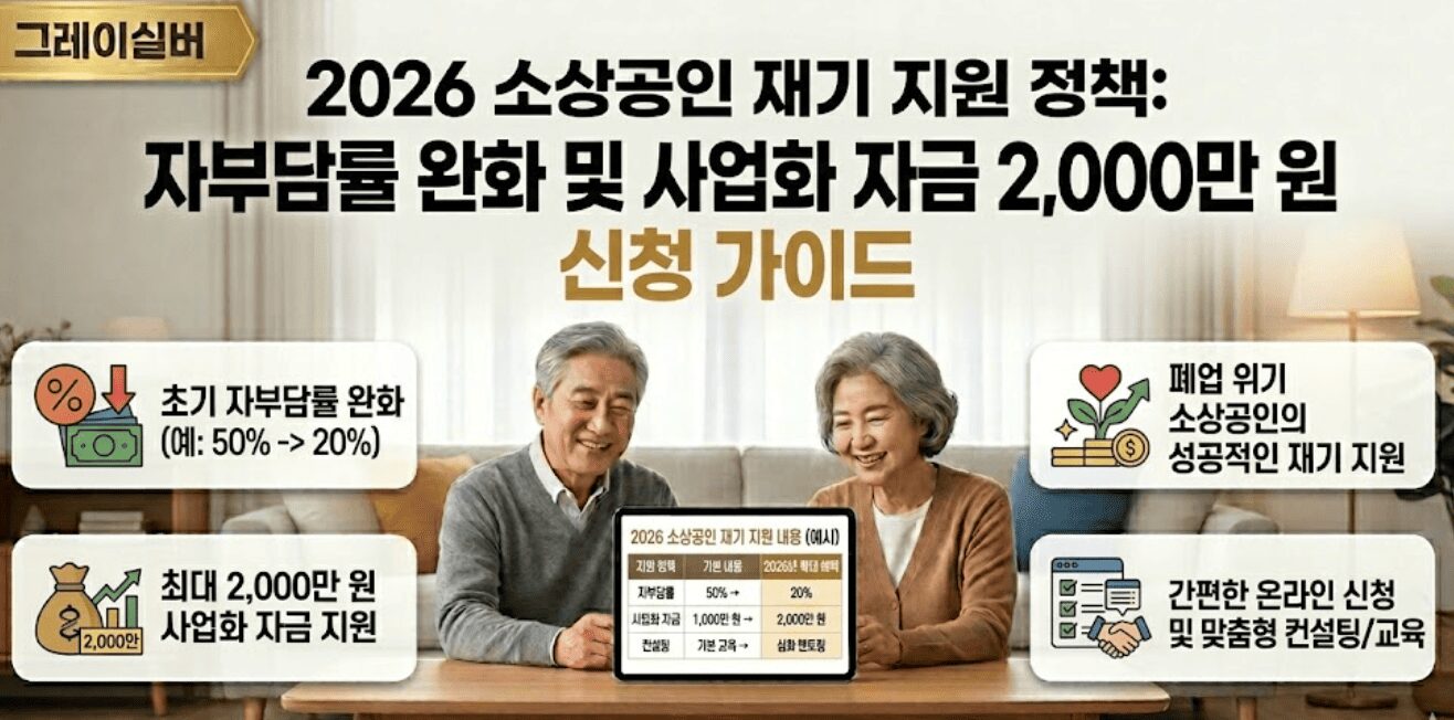 은퇴 후 퇴직금으로 제 2의 인생을 위한 사업을 하시는 분들이 많지만 쉽지 않은 것이 사실, 이런 분들을 위해 역대 최대 5.4조 원 예산 편성, 자부담률 100%→50% 완화! 2026년 소상공인 재도약 지원의 모든 것을 정리했습니다.