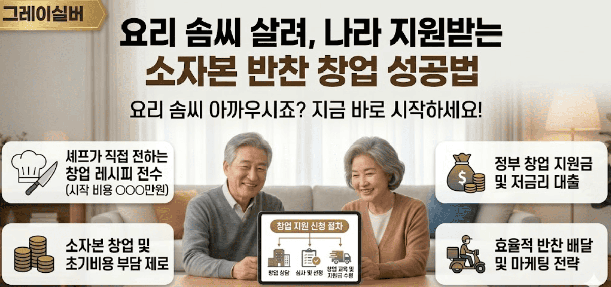 수십 년의 요리 경험은 젊은 창업자가 단기간에 따라올 수 없는 실력입니다. 어르신표 손맛, 건강식 노하우, 재료 선별 안목은 그 자체로 차별화된 브랜드가 됩니다. ‘엄마표 반찬’, ‘건강한 집밥 반찬’이라는 콘셉트는 1인 가구, 맞벌이 가정, 노인 부양 가정 모두에게 통합니다.