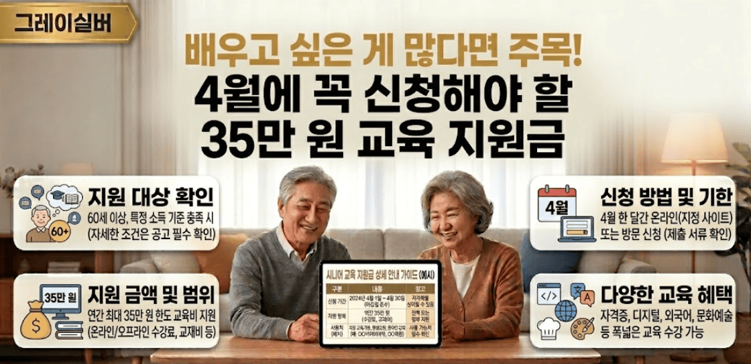 외국어, 자격증, 취미 강좌를 35만 원 바우처로 무료 수강! 2026년 평생교육이용권(평생교육 바우처)은 선착순·추첨 방식으로 빠르게 마감됩니다. 65세 이상 어르신을 위한 ‘노인 이용권’도 별도 운영 중입니다. 신청 전략부터 시니어 추천 강좌까지 한눈에 정리했습니다.