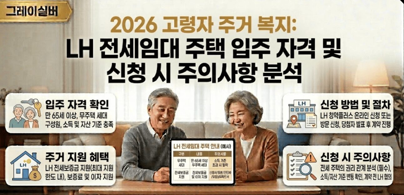 4~5월 본격 모집 시작! 전세금 최대 1억 3,000만 원을 LH가 대신 내주고, 어르신은 월 몇만 원만 내면 되는 고령자 전세임대 주택. 입주 자격부터 당첨 확률 높이는 서류 준비법까지 한눈에 정리했습니다.